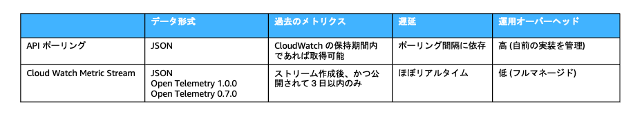 両方を組み合わせたハイブリッドアプローチも有効です。例えば、最新のデータは CloudWatch Metric Streamsで転送し、必要に応じて過去のデータを API ポーリングで取得する方法が考えられます。