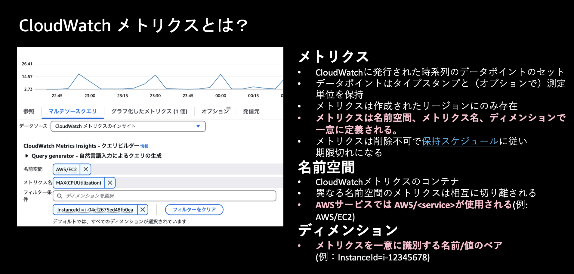 CloudWatch メトリクスは、CPU 使用率やメモリ使用量といったパフォーマンス測定値を時系列データとして収集します。各メトリクスは AWS/EC2 や AWS/RDS といった名前空間で分類され、さらに、インスタンス ID やインスタンスタイプなどのディメンション(名前と値のペア)で一意に識別されます。