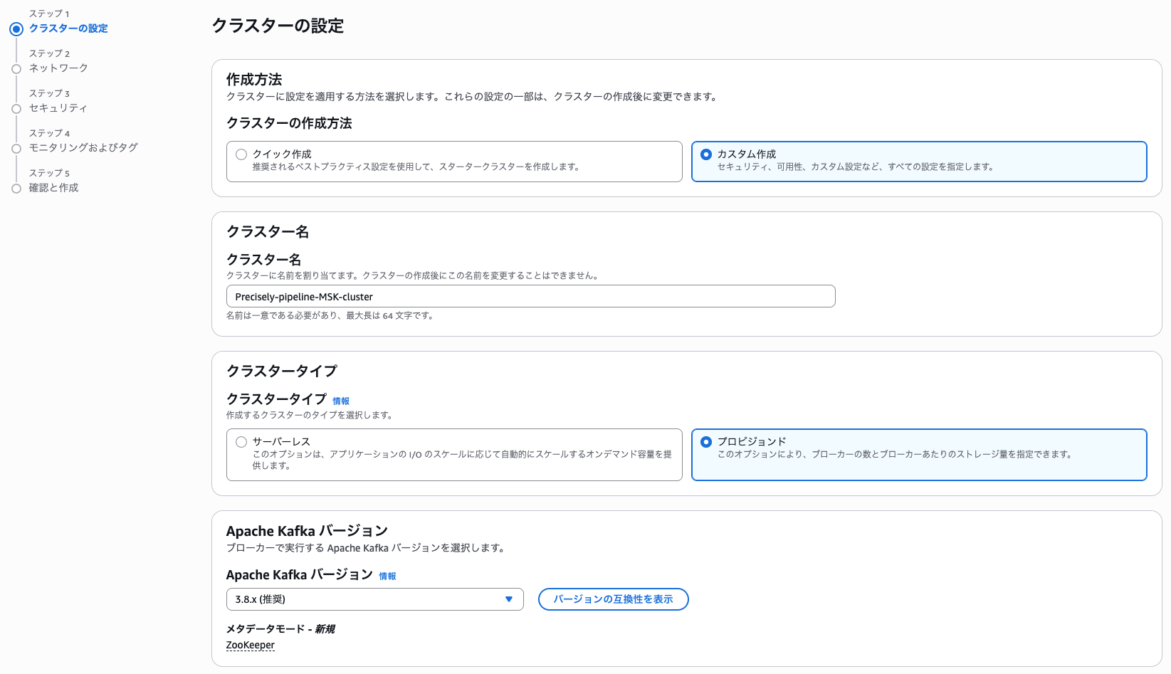 次に、Apply Engine から送信されたデータを処理する MSK 部分を構築します。構築の最初のステップは、マネジメントコンソールで、MSK のコンソール画面に移動して、MSK クラスターを作成することから始まります。Apply Engine と MSK クラスターが安全に通信するために、今回は同じ VPC 内に両者が存在する構成を採用します。クラスタータイプは Provisioned を選び、Apply Engine の VPC へ配置していきます。Apache Kafka バージョンは要件によって変わりますが、今回は特殊要件は想定しないため最新版を選びます。
