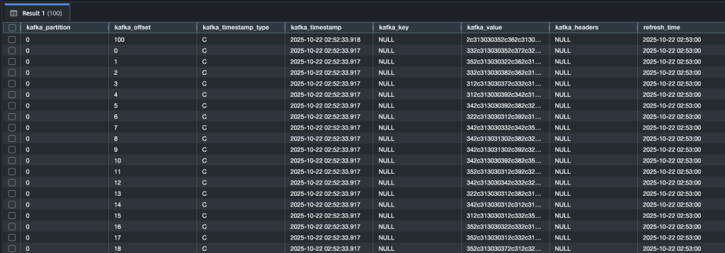 実際にデータ連携を行うと、作成したビューの中では、kafka_value のカラムに受信したレコードのデータがそのまま保管されていることがわかるかと思います。このままではビジネス分析に必要なデータ参照がやりにくいため、受信したデータを整形処理したマテリアライズドビューを改めて作成します。今回のサンプルデータで売上データを集計するために、以下のような変換を行います。