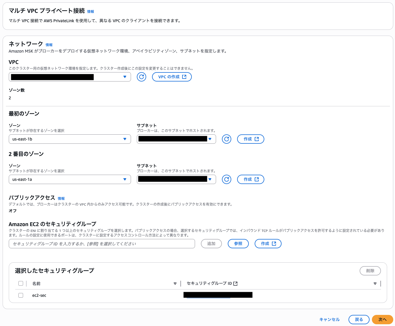 続いて、ネットワーク設定を行います。まずは対象として Apply Engine が展開された VPC を選択します。そして「最初のゾーン」として、指定した AZ それぞれに対応するサブネットを選択します。セキュリティグループについては、Apply Engine ホストと EC2 の両方に同一なセキュリティグループを使用するか、Kafka が利用するポートが開放され接続・疎通が可能なセキュリティグループを準備して指定してください。