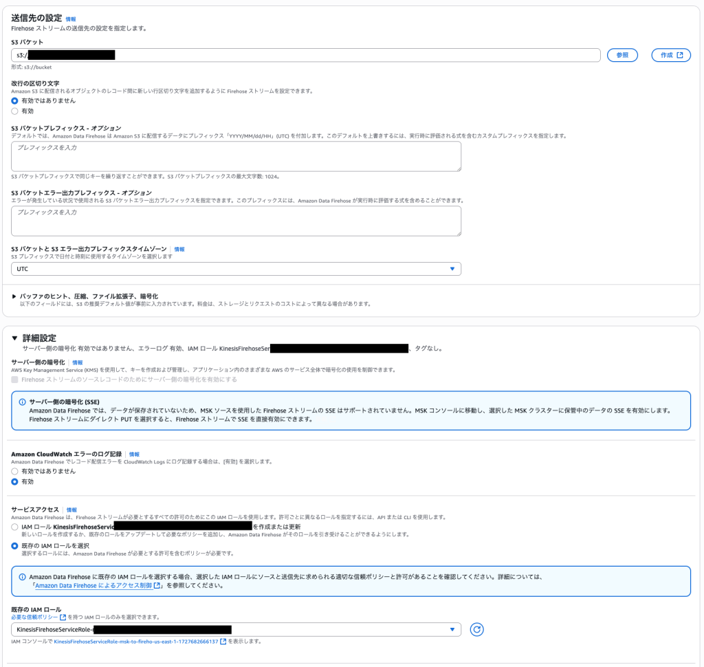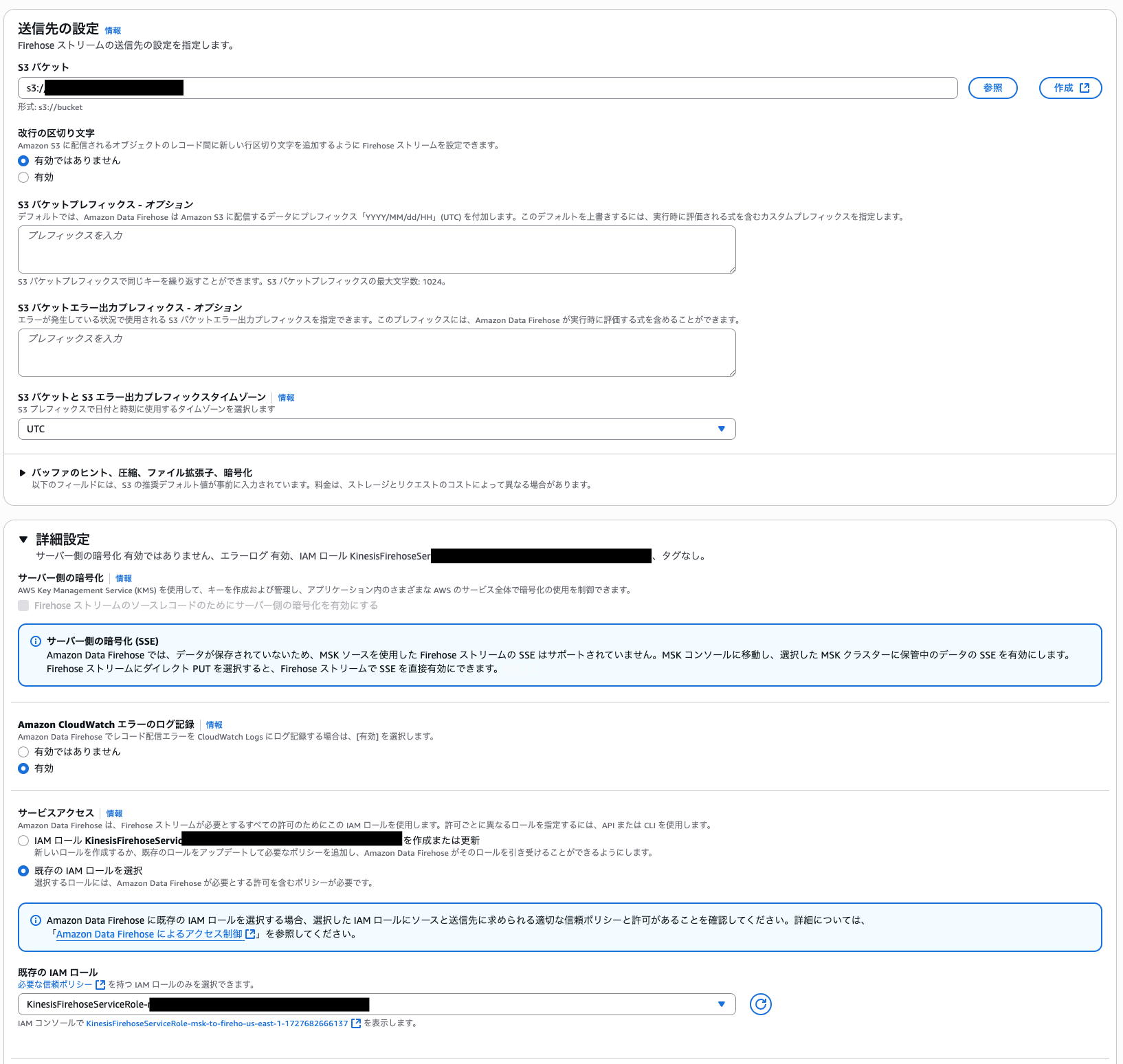 次に、データソースを MSK クラスター、送信先を S3 バケットとした Data Firehose の作成を行います。手順は以下の通りです。