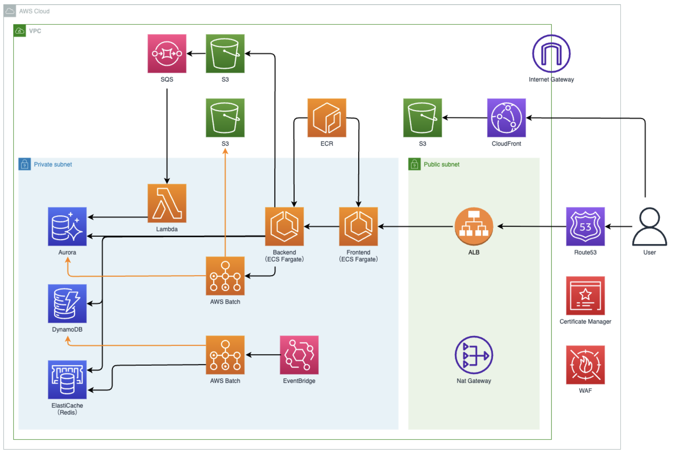 AWS: 具体的なアーキテクチャについて教えていただけますか? e-dash 伊藤・竹内: 「e-dash」のインフラは基本的に AWS で構築しています。スタートアップとして限られた人数で運用する必要があるため、フルマネージドサービスを積極的に採用し、インフラ管理の負担を最小限に抑えています。アーキテクチャの基本は Amazon ECS on Fargate と Amazon Aurora を利用しています。フロントエンドとバックエンドのアプリケーション実行基盤として ECS on Fargate を採用しています。CSV のエクスポート処理などは AWS Batch、アップロード処理は AWS Lambda を利用しています。