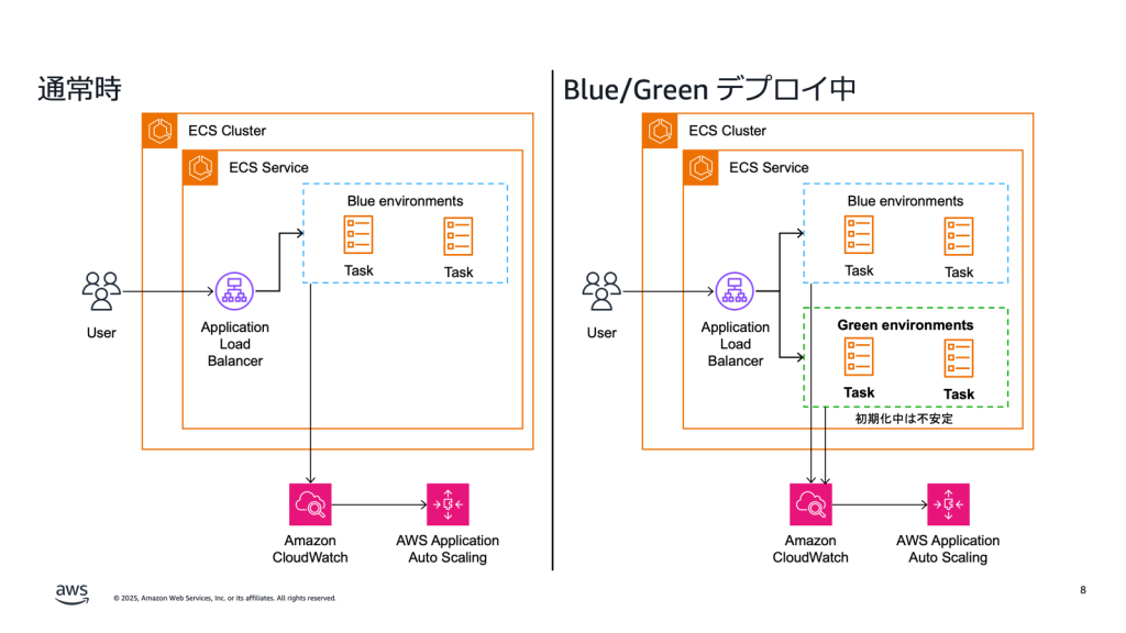まず、複雑になるタイミングについて、Auto Scaling は常に対象のサービスのメトリクスを読み取りスケールを判断しています。一方、Blue/Green デプロイメントは、アプリケーションの更新時のデプロイ戦略の一つであるため、デプロイタイミングで一時的にデプロイ中という状態が発生します。