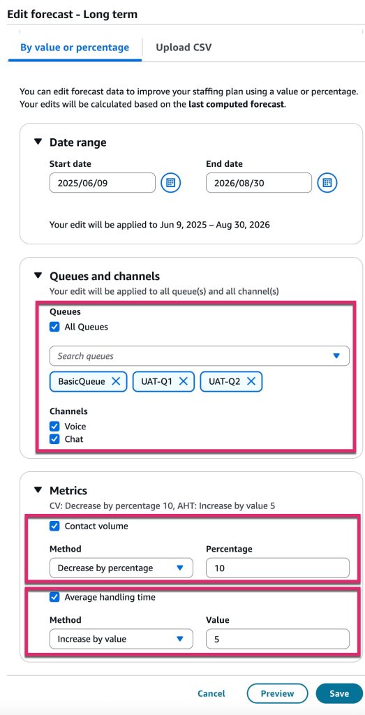 Amazon Connect では、UI を使用して予測を調整する 3 つの簡単な方法が提供されるようになりました。パーセンテージによる調整、数値の加算/減算、または特定の数値によるシステム生成予測の置き換えです。これは、ビジネス全体、特定のキュー、またはチャネル(電話やチャットなど)ごとに予測を微調整できるスマートリモコンを持っているようなものです。例えば、ホリデープロモーションを実行している場合、他の予測は変更せずに、セールス予測グループのみで予想されるチャットボリュームを 20% 迅速に増加させることができます。