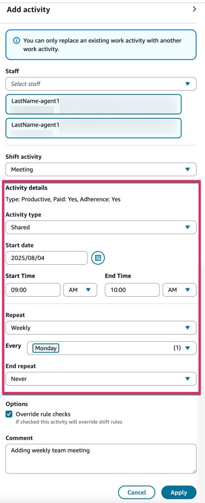 - 定期アクティビティを作成する際、「Override rules(ルールの上書き)」をチェックすると、労働時間制限などの制限をバイパスできます。チェックしない場合、ルールに違反するエージェントにはアクティビティが割り当てられません。どのエージェントが除外されたか、その理由を Actions ログで確認できます
