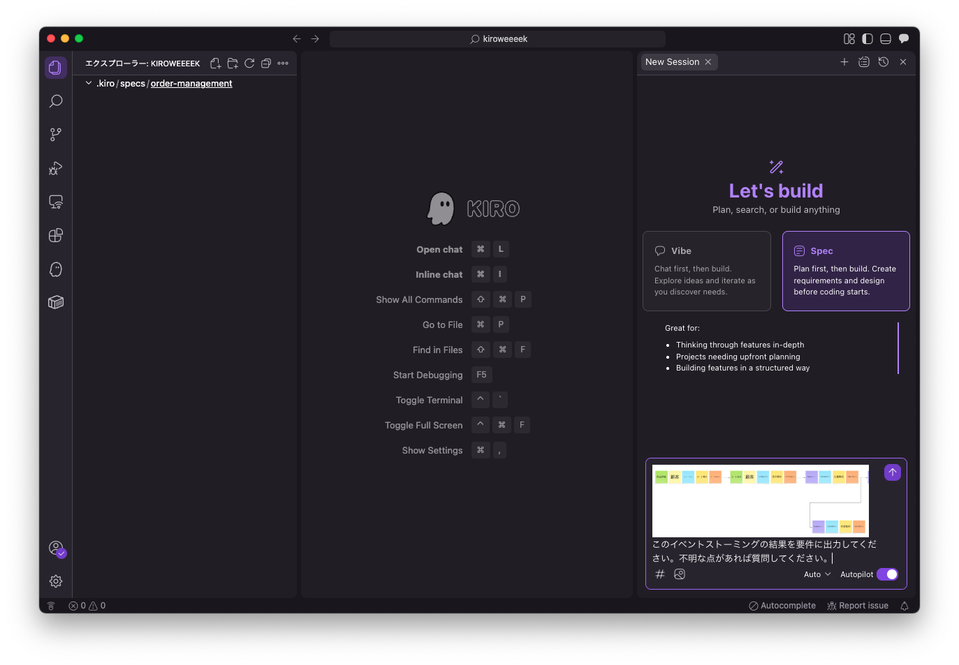 イベントストーミングの画像を Kiro に添付し、以下のシンプルなプロンプトを送りました。Kiro は画像も理解してくれます。
