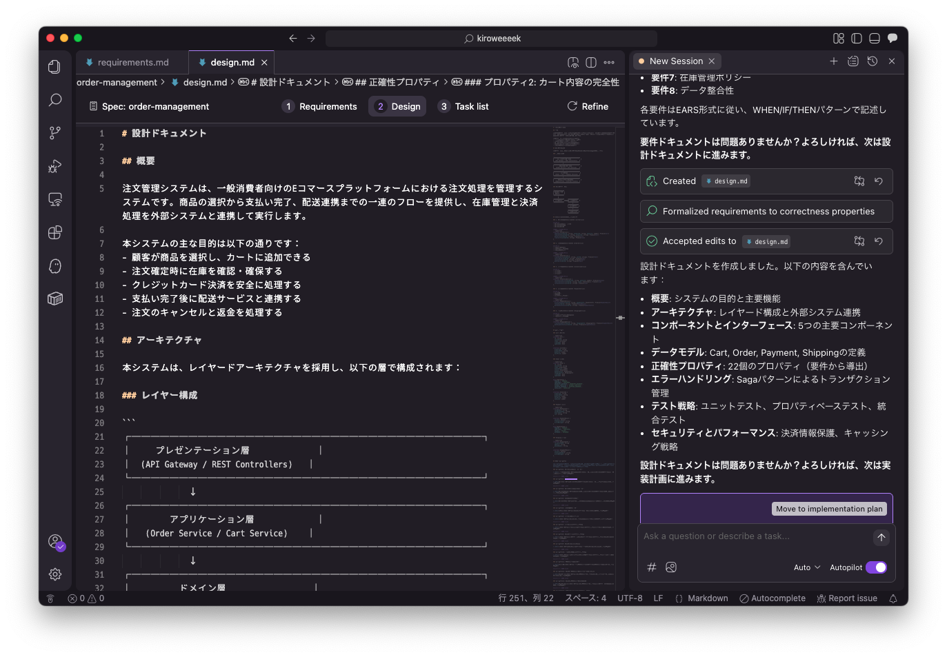 要件が確定したら、次は設計フェーズに進みます。設計フェーズでは、requirements.md をベースとした設計ドキュメント(design.md)が生成されます。ここからは、要件がどのように実際の構造へと落とし込まれていくかを見ていきます。今回の設計ドキュメントには、以下の情報が含まれていました。先ほどと同じように、ここでも Kiro はドキュメントの生成後、レビューのために待機します。