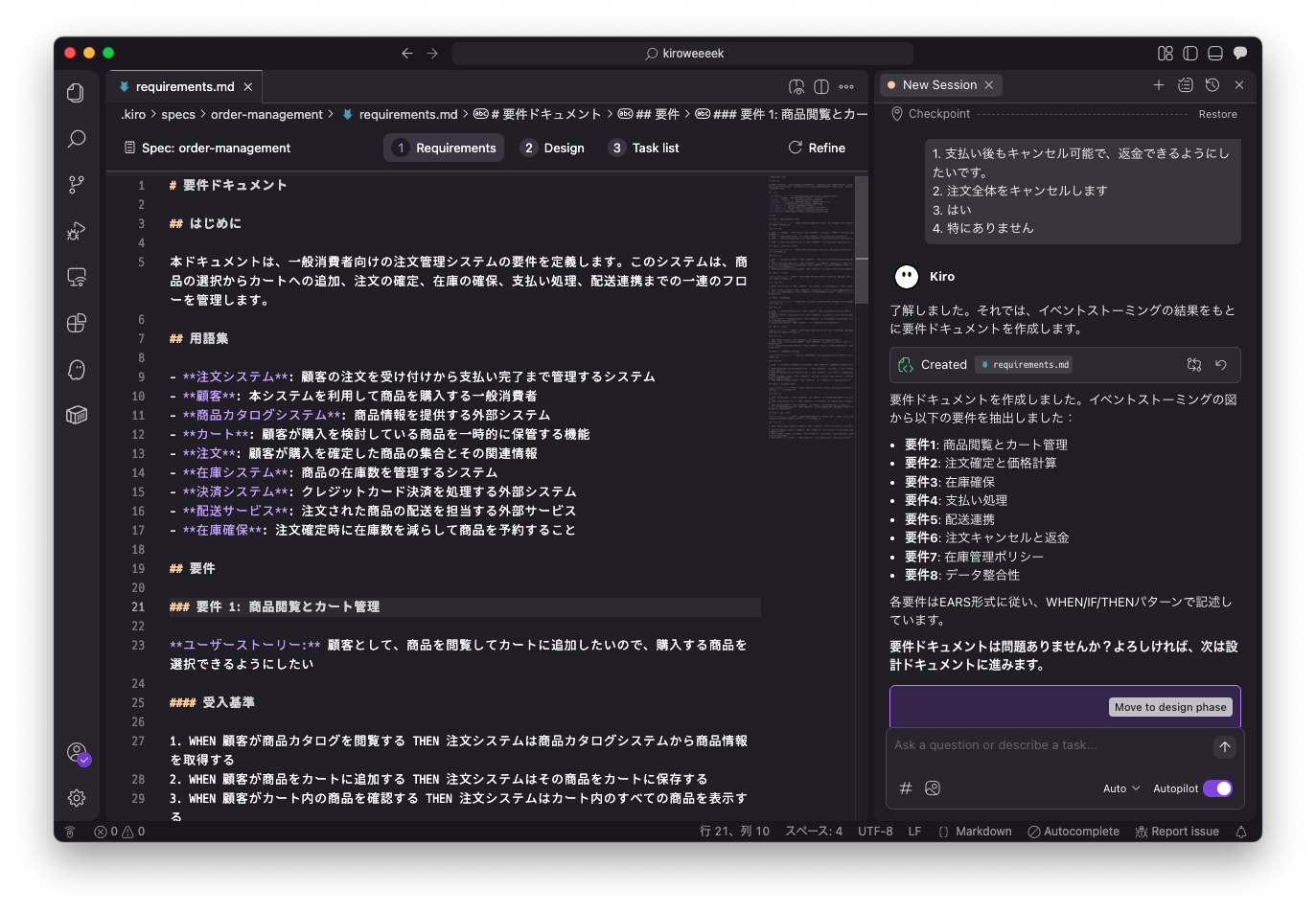 Kiro へ質問を返すと、以下のような構成の要件のドキュメント(requirements.md)が生成されました。Kiro はドキュメントの生成後、この要件で問題がないかを確認し、返答を待機します。(Move to design phase ボタンが表示されます。)この段階でレビューを入れられることで、Kiro の認識にズレがないかを早期にチェックできます。