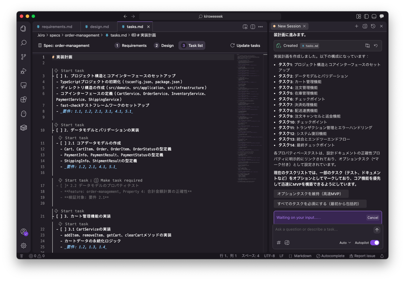 設計が完了すると次は実装タスク(tasks.md)を生成します。例えば、次の画像の「2.2 データモデルのプロパティテスト」は、最初はオプションタスク扱いになっており、タスクリスト上でも文字色がグレーアウトされています。しかし、チャットに表示されている「全てのタスクを必須にする(最初から包括的)」のボタンを押すことで、プロパティテストも含んだタスクのリストが出来上がります。あとは、タスクリストもレビューをして、Kiro のエディタ上に表示されている Start task ボタンから実装を開始するだけです!実装後もレビューは忘れないようにしましょうね!