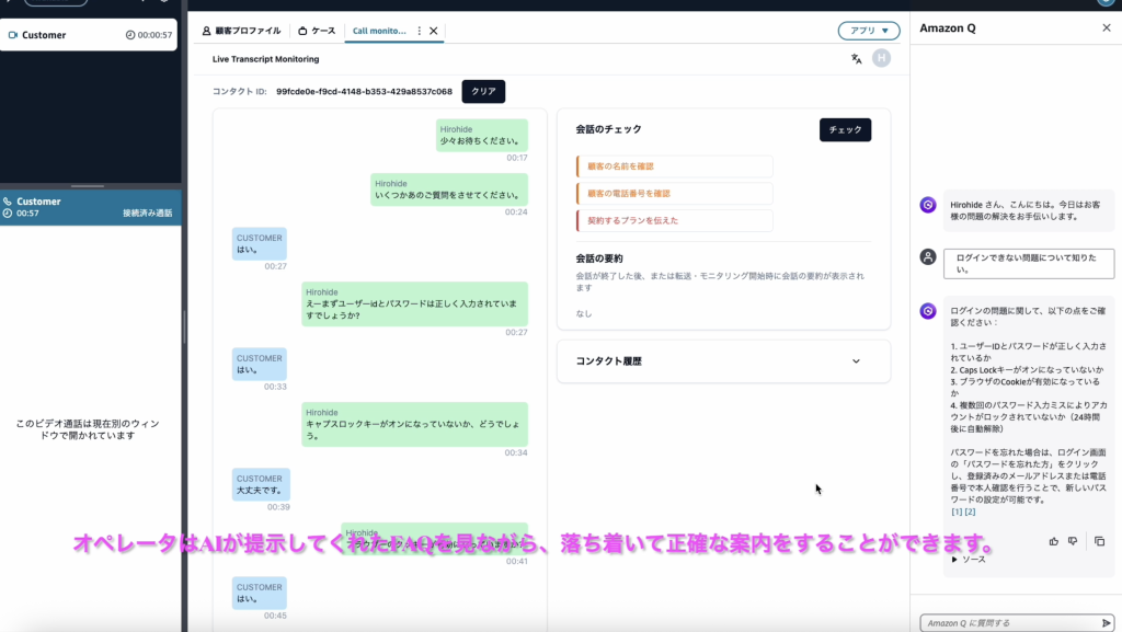 Amazon Connect によるコンタクトセンターのリファレンスアーキテクチャに、通話のライブ文字起こし機能、生成 AI を利用した通話チェックと要約機能を追加しました。他にも、ウェブ通話、Amazon Q in Connect の AI アシスタント (下図参照)を追加し、あらゆるチャネルでのカスタマーエクスペリエンスを向上策として使っていただく事ができます。こちらからすぐにデプロイして試していただく事が出来ます。