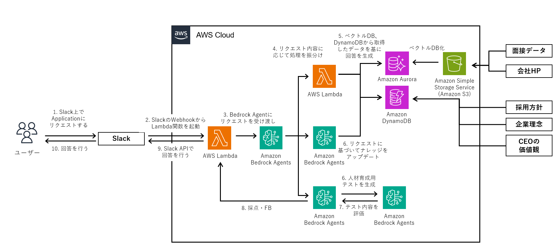 こうした課題に対して、サンブリッジ様は Amazon Bedrock を中心に据えた「採用担当向け育成 AI コーチ」の構築に取り組みました。採用担当者が日常的に抱く疑問を即座に解消できるよう、Bedrock の大規模言語モデルを活用した対話型チャットボットを開発し、CEO が普段重視している判断ポイントや候補者との向き合い方を学習させることで、担当者がいつでも CEO の視点に近い回答を得られるようにしました。