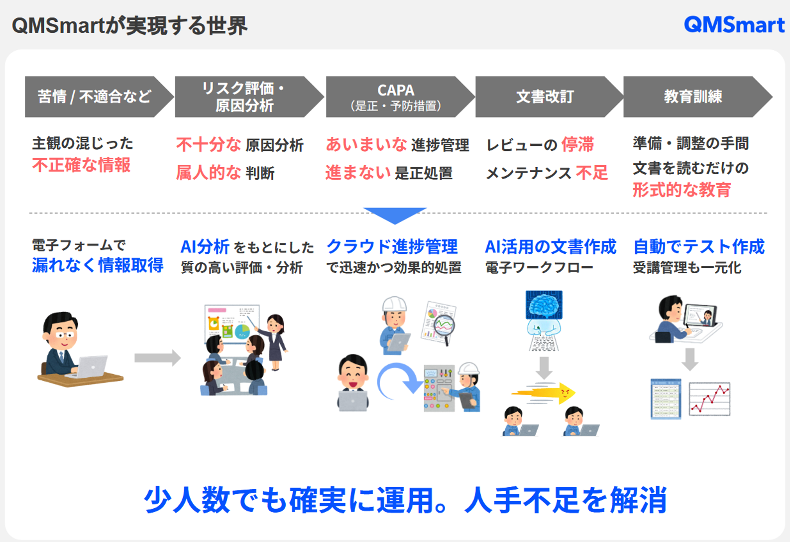 そのような中で、医療機器業界では、品質管理システム(QMS)の運用に関わる業務負担が大きく、人手不足が深刻な課題となっています。特に厳格な規制要件への対応や膨大な文書管理、品質イベント処理などは、多くの医療機器メーカーにとって大きな負担となっています。