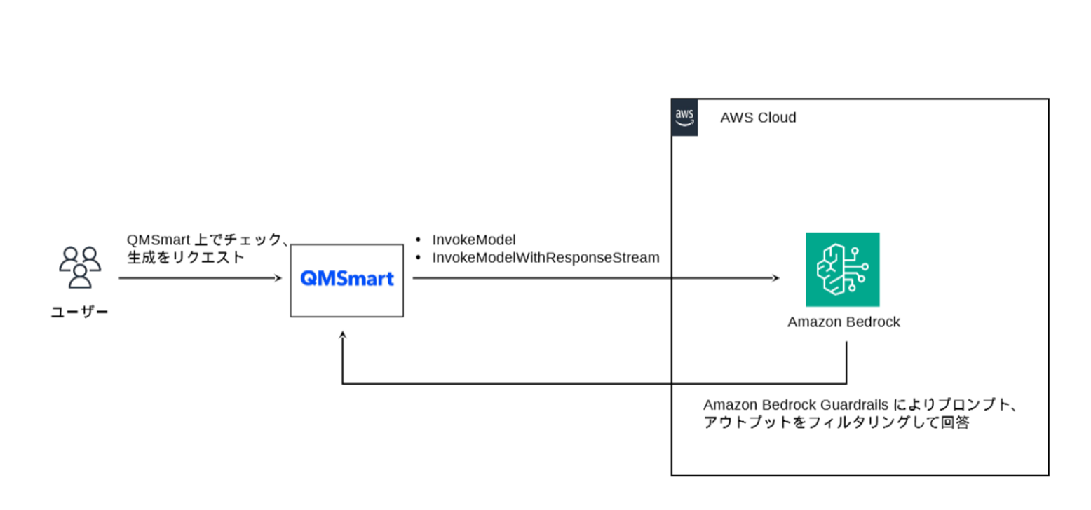 QMSmart の AI 機能は、インフラストラクチャの管理・運用負荷の少ないマネージドサービスで構成されています。システム構成は、QMSmart から Amazon Bedrock の基盤モデルを呼び出してレスポンスを受け取る形で実現されています。