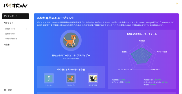 「パイオにゃん」は、Slack、Googleドライブ、GitHubといった社内の多様な情報源と連携し、過去のやり取りや文脈を深く理解することで、各個人に最適化されたアドバイスや情報を提供します。利用者のスキル向上と連動してAI自身もレベルアップし、アバターが視覚的に成長していく「AI成長システム」です。これにより、社員はゲーム感覚で自身の成長を実感でき、学習意欲の向上を促します。