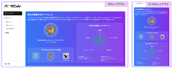 「パイオにゃん」の成長度合いや、社員のAIリテラシーレベルが一目でわかる専用のダッシュボードを提供します。猫のアバターが子猫から成猫へと成長していく様子を視覚的に確認でき、AIリテラシーレベルに応じた機能のアンロックや高度なアドバイスが提供されゲーム感覚でAI活用を促進し利用者のモチベーションを維持しながら、継続的なスキルアップを促します。画面は全てレスポンシブデザインで、PC・タブレット・スマートフォンなどデバイスを選ばず操作可能としました。