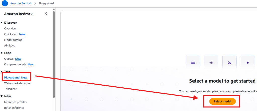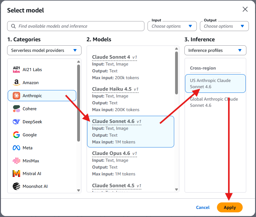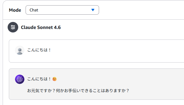 Select model で、使いたいモデルを選択してください。まず、利用可能なモデルはリージョンごとに異なるため、現在 AWS Console で選択しているリージョンと、Model support by AWS Region を見比べ利用可能なリージョンを選択しているかご確認をお願いいたします。us-east-1 で Anthropic Claude の Sonnet 4.6 で US の推論プロファイルを使っています。