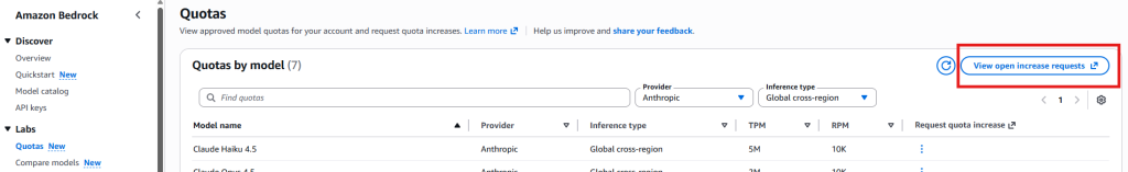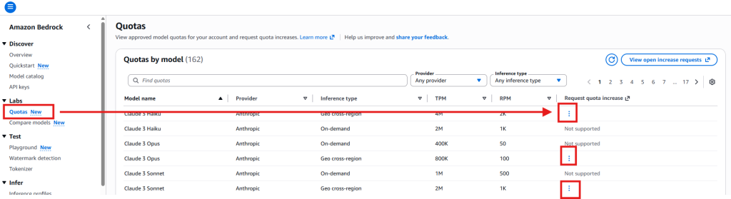 制限値を上げるには、Amazon Bedrock の同じ画面から “Quotas” のメニューを選択します。少し UI がわかりづらいですが、上限緩和が可能なモデルは “Request quota increase” のところが三本の点になっていて、こちらをクリックすると上限緩和申請を挙げることができます。