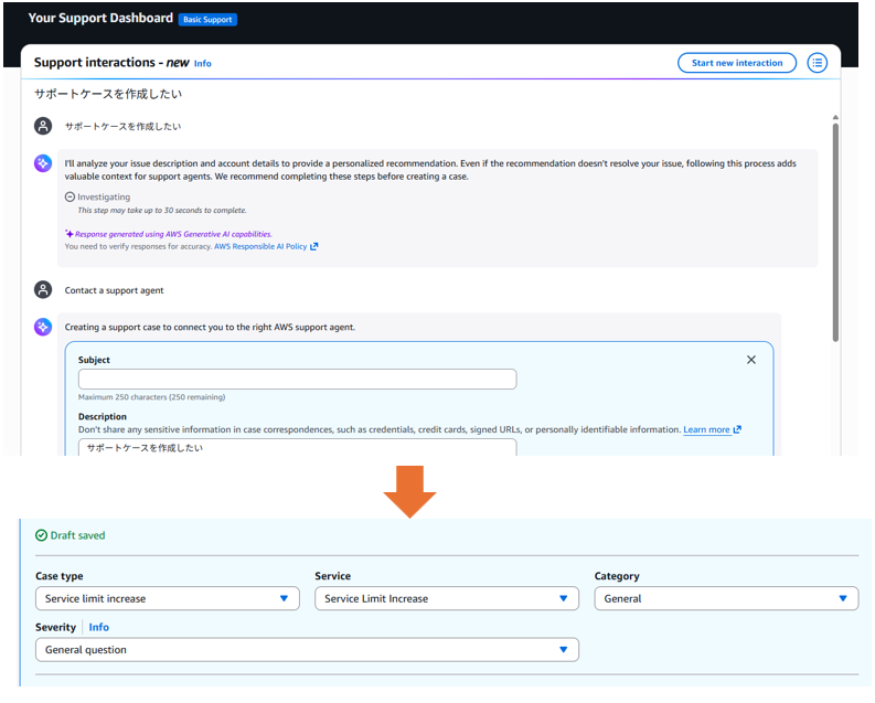 新 UI の場合、”サポートケースを起票したい” とリクエストして作成してください。
