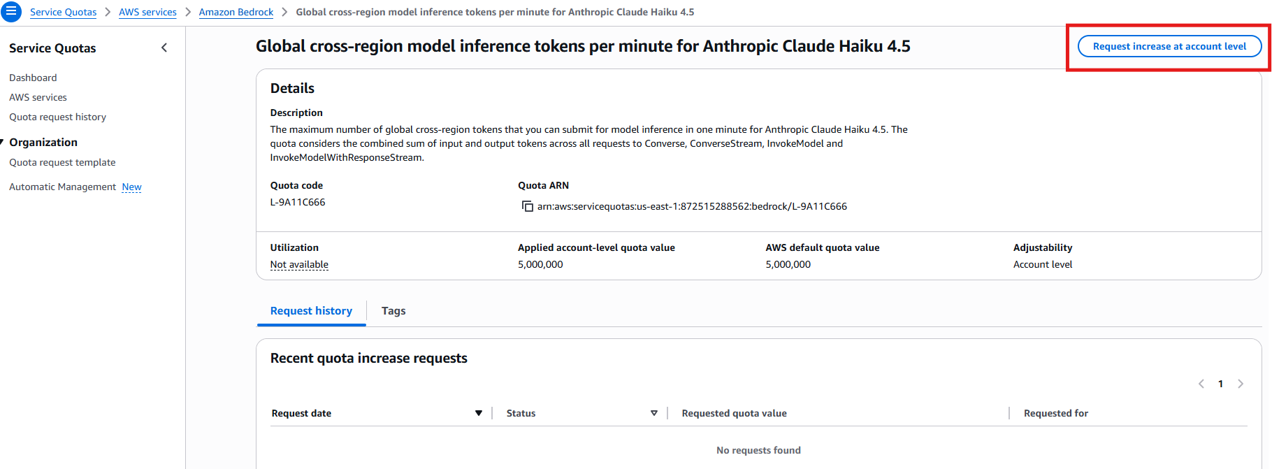 Amazon Bedrock で XXX のリージョンで件名のモデルの Quotas 上限を引き上げようとしたところ、アカウントレベルでの調整ができなかったためケースを起票させていただきました。現在、プロジェクトの検証のため・・・(以下、個別事情と希望する制限値について記載ください)