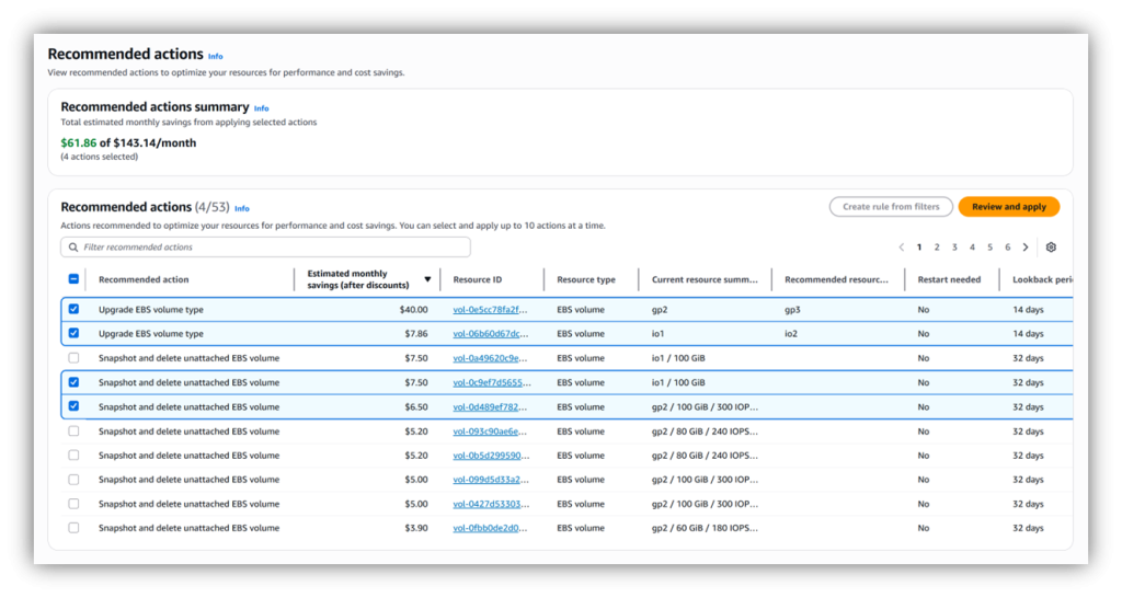 ボリューム ID をクリックすると、レコメンデーションの詳細を確認できます。AWS リージョンやリソースタグでフィルタリングして、最適化したいフリートの特定のセグメントを対象にできます。レコメンデーションを確認した後、適用したいアクションを選択し、次のページで確認して実装を開始します(図 1 を参照)。この手動のアプローチは、一回限りのクリーンアップ作業や、各アクションの確認が必要な場合の最適化プロセスの学習に最適です。