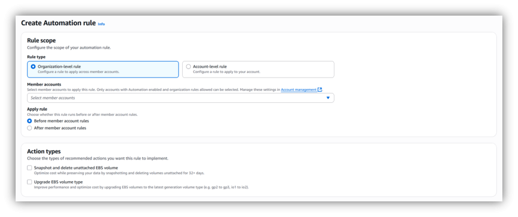 最初の自動化ルールは小規模に始めて、戦略的に規模を拡大してください。まずは非本番環境を対象にして、自動化プロセスへの確信を深めていきましょう。特定のアカウントを選択するか、「Environment: Development」や「Environment: Test」などのリソースタグに基づいてフィルタリングすることで、開発環境やテスト環境でアタッチされていない Amazon EBS ボリュームのクリーンアップに焦点を当てたルールを作成してください。