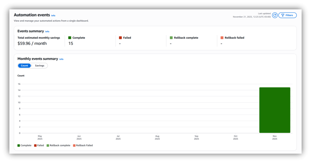 新しいダッシュボードでは、すべての自動化の状況を把握でき、ステータスと実行月ごとのイベント数と推定月間節約額の概要が表示されます。時間の経過に伴う自動化の進捗状況を追跡でき、必要に応じて最適化戦略を改善するのに役立ちます。