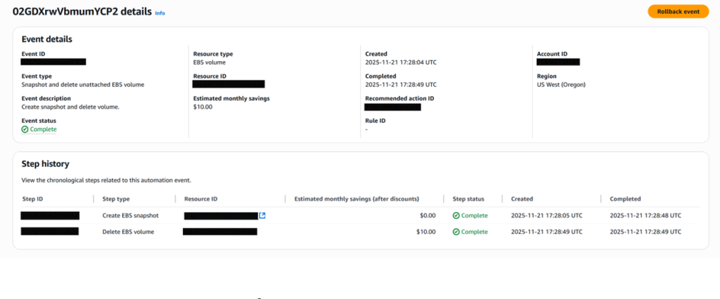 ルールを日次、週次、または月次で実行するように設定すると、Compute Optimizer はその条件に照らして新しいレコメンデーションを継続的に評価します。これにより、新たに特定された “アタッチされていないボリューム” は自動的にスナップショットが作成されて削除され、古い世代のボリュームタイプはルールに従って自動的にアップグレードされます。手動での介入は必要ありません。