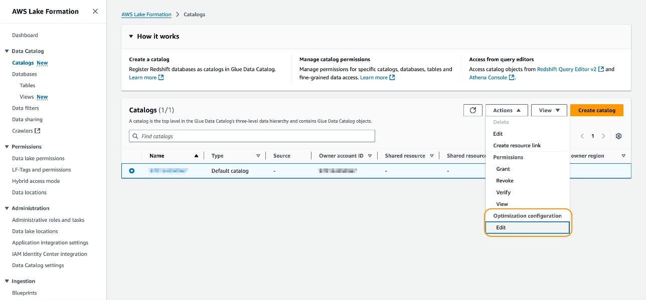 - Lake Formation コンソールで、ナビゲーションペインの Catalogs を選択します。