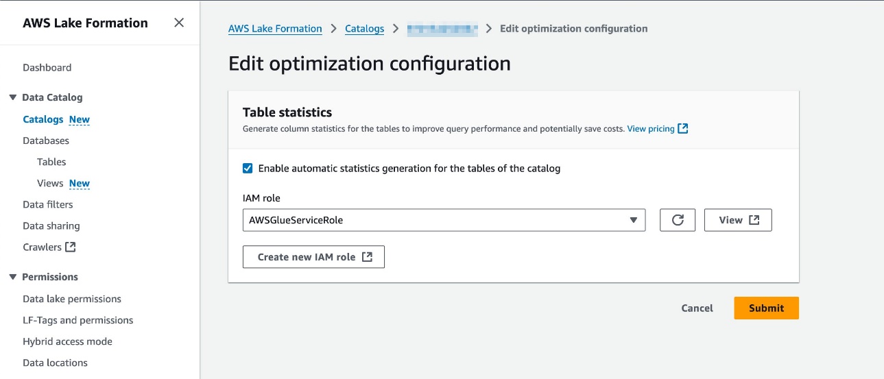 - Enable automatic statistics generation for the tables of the catalog を選択し、IAM ロールを選択します。必要な権限については、カラム統計を生成するための前提条件を参照してください。