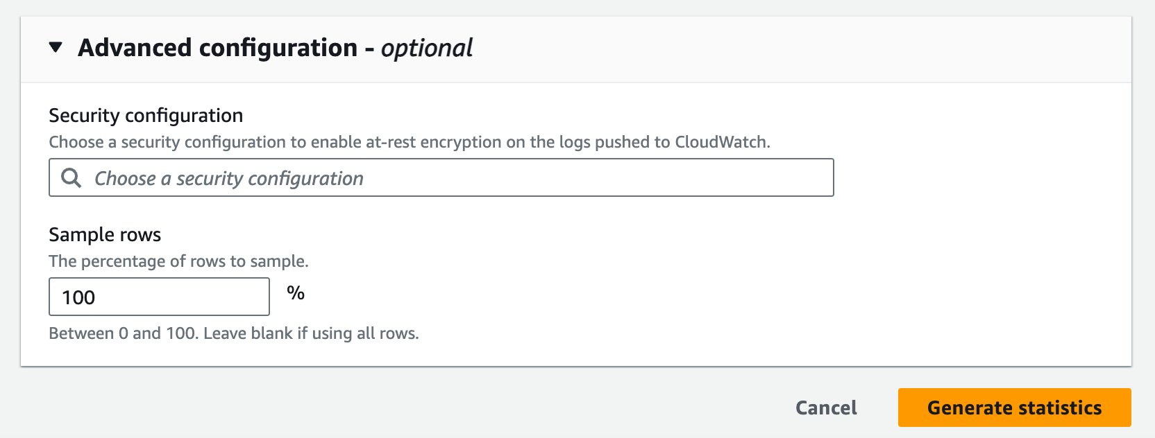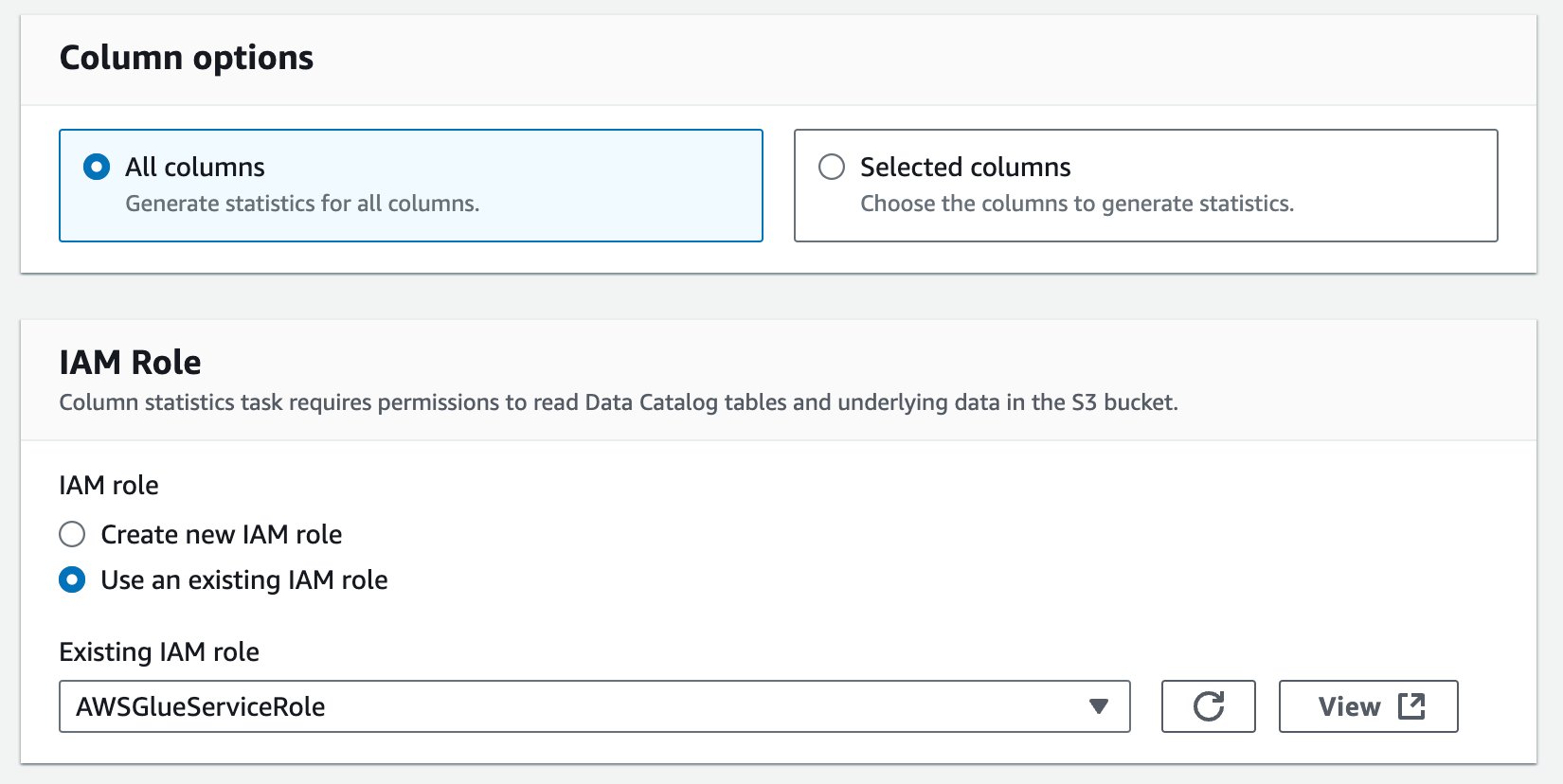 - IAM role で、既存のロールを選択するか、新しいロールを作成します。必要な権限については、カラム統計を生成するための前提条件を参照してください。