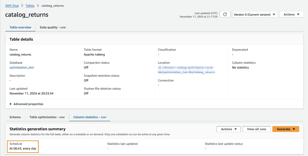 テーブルが作成または更新された後、AWS Glue コンソールでテーブルの説明を確認することで、統計収集設定が設定されていることを確認できます。設定には Schedule プロパティが Auto に、Statistics configuration が Inherited from catalog に設定されているはずです。以下の設定を持つテーブル設定は、AWS Glue によって内部的に自動的にトリガーされます。