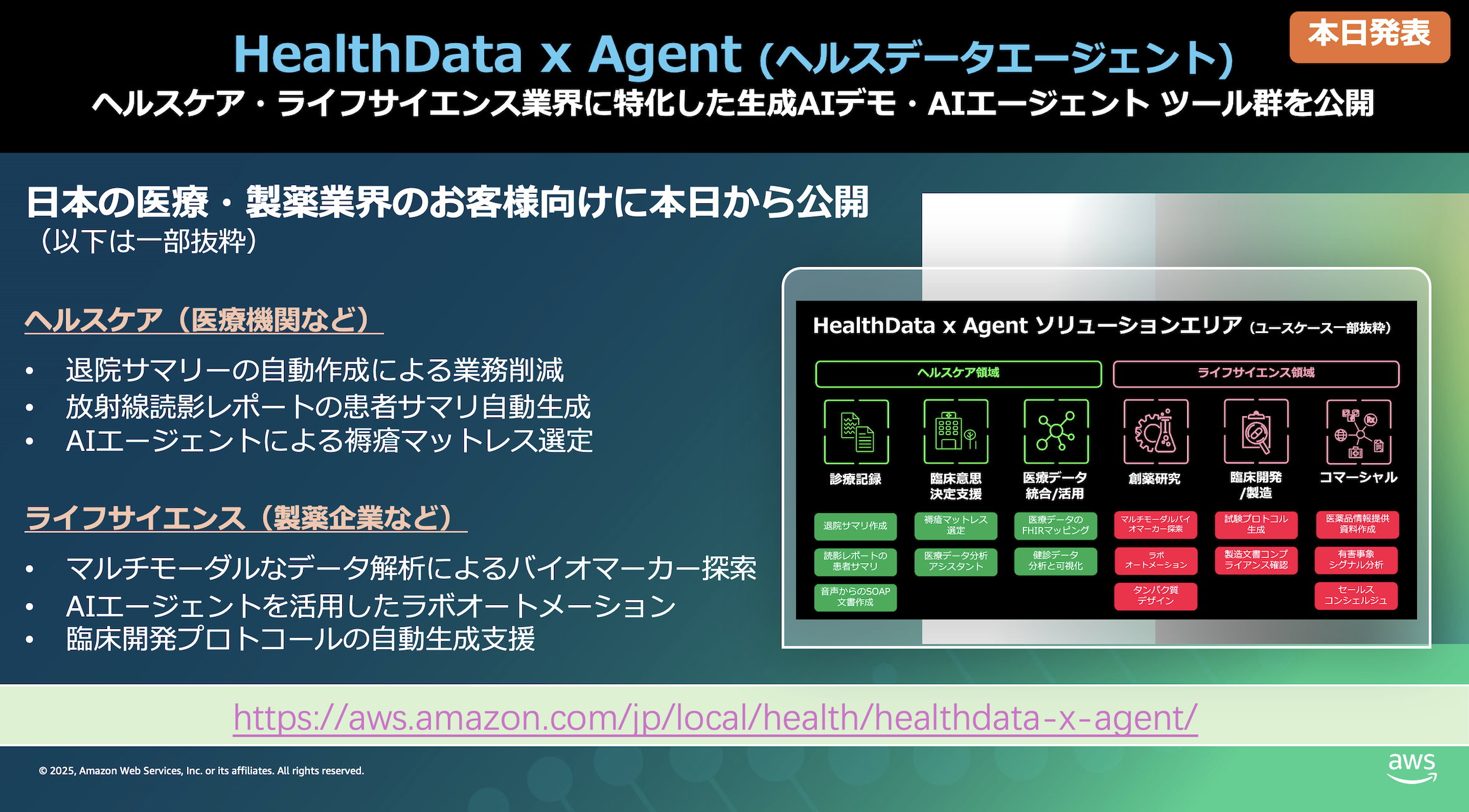 AWSは医療・製薬業界向けに「HealthData x Agent(ヘルスデータエージェント)」を新たに発表します。これは50個のユースケースに対応したデモ動画とツール群を無料で提供し、生成AIの具体的活用シナリオを示すものです。 医療機関向けには、診療記録から退院サマリーを自動生成するツールで医師や看護師の事務負担を軽減し、患者との時間を確保。製薬企業向けには、AI エージェントが化合物情報や試験データを統合解析し、創薬サイクルを大幅に短縮するツールを提供します。