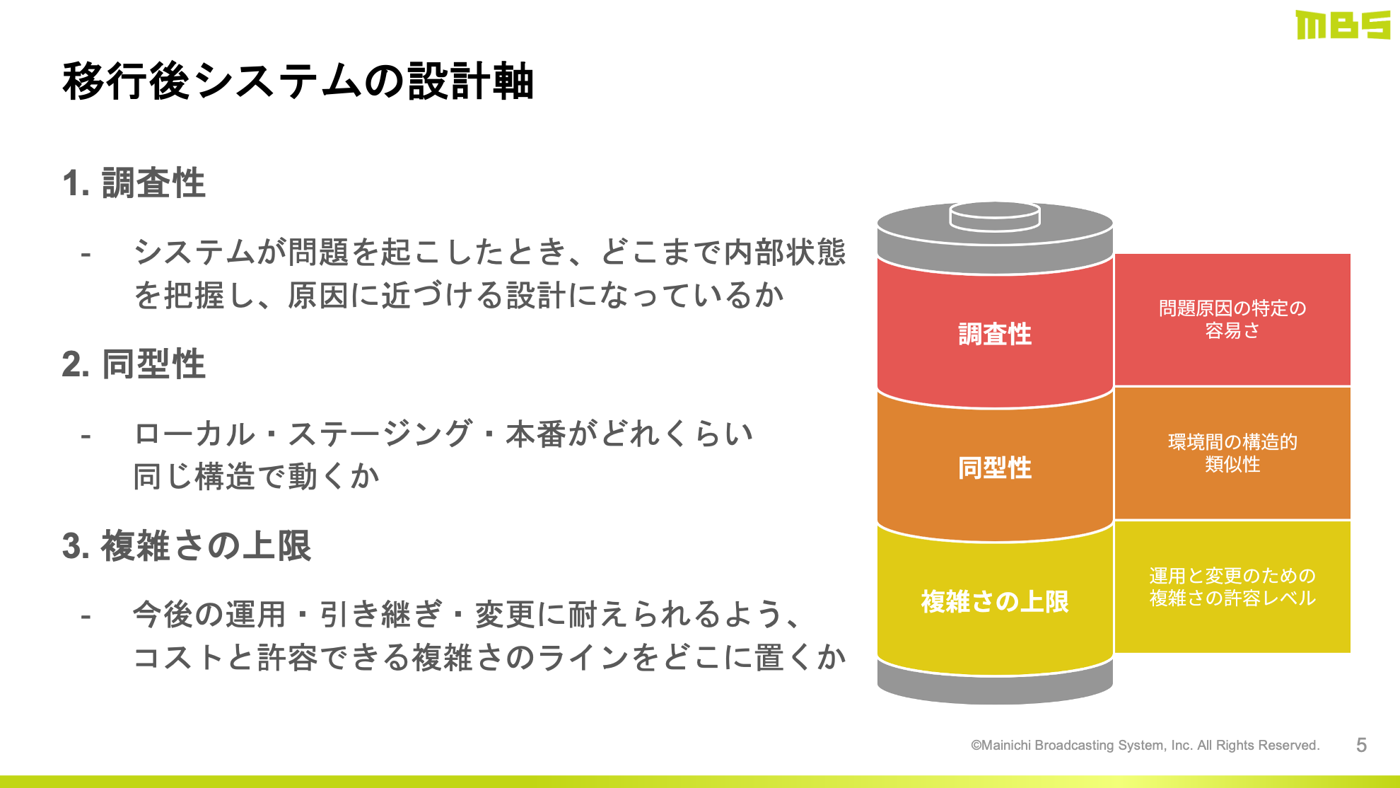 著作権管理システムをクラウドサービスから AWS へと移行する際に考慮した「調査性の向上」「同型性の実現」「複雑さの上限を設定」という3つの設計の考え方についてお話しをいただきました。調査性の向上、つまり内部状態の確認とデバッグをより容易に実現するために、これまで使用していたクラウドサービスでは実現が難しかったコンテナ内部へのアクセスを、 Amazon ECS およびその一機能である ECS exec を用いることで実現しました。また AWS Lambda と Amazon CloudWatch を組み合わせて、エラーの通知などをリアルタイムに Slack に送るなどの工夫も施しています。