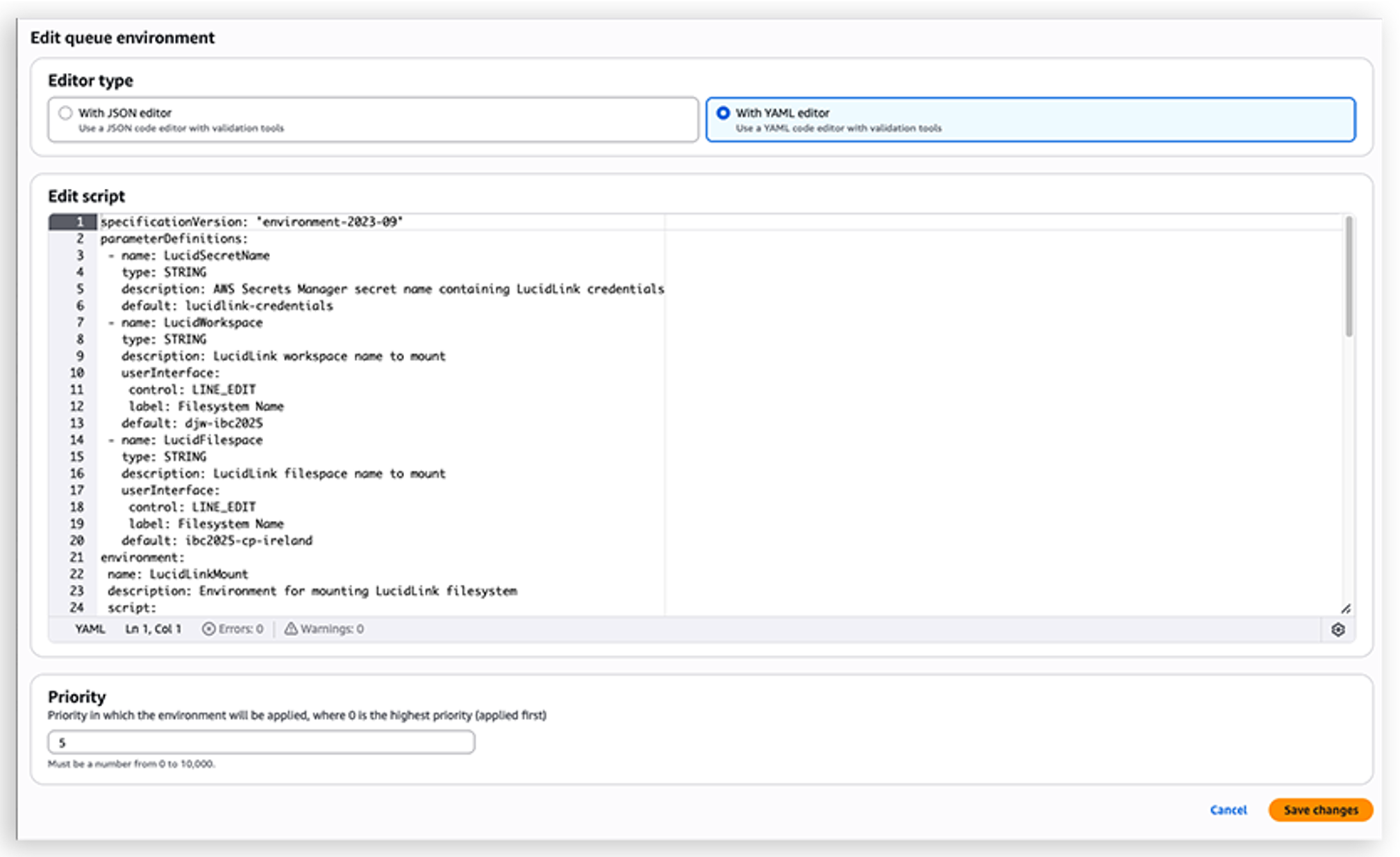 図 3. AWS Deadline Cloud のQueue Environments編集ページ