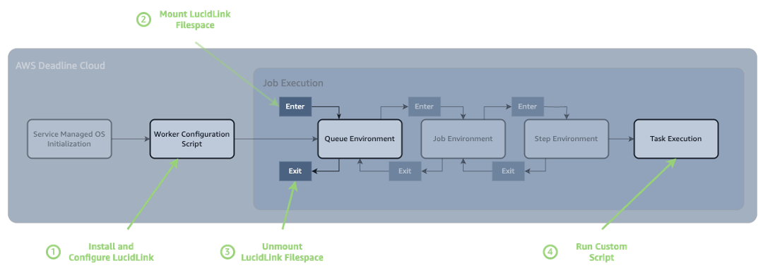 LucidLink のインストールとファイルシステムのマウントを分離することで、柔軟でメンテナンスしやすい構成を実現できます。サービスマネージドフリートが 1 回限りのクライアントインストールを処理し、OpenJD ジョブテンプレートがジョブごとのファイルシステムマウントを管理することで、以下のメリットが得られます。
