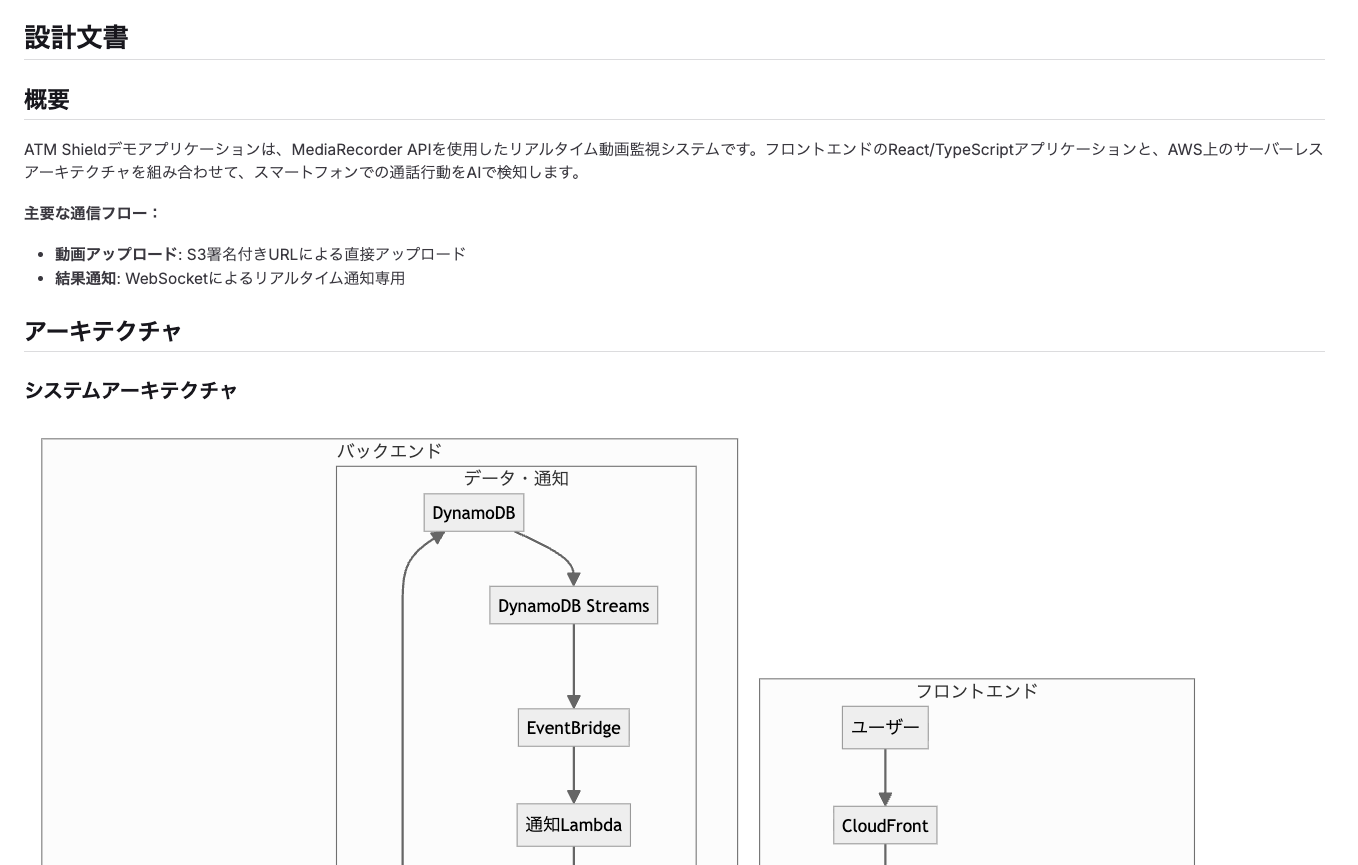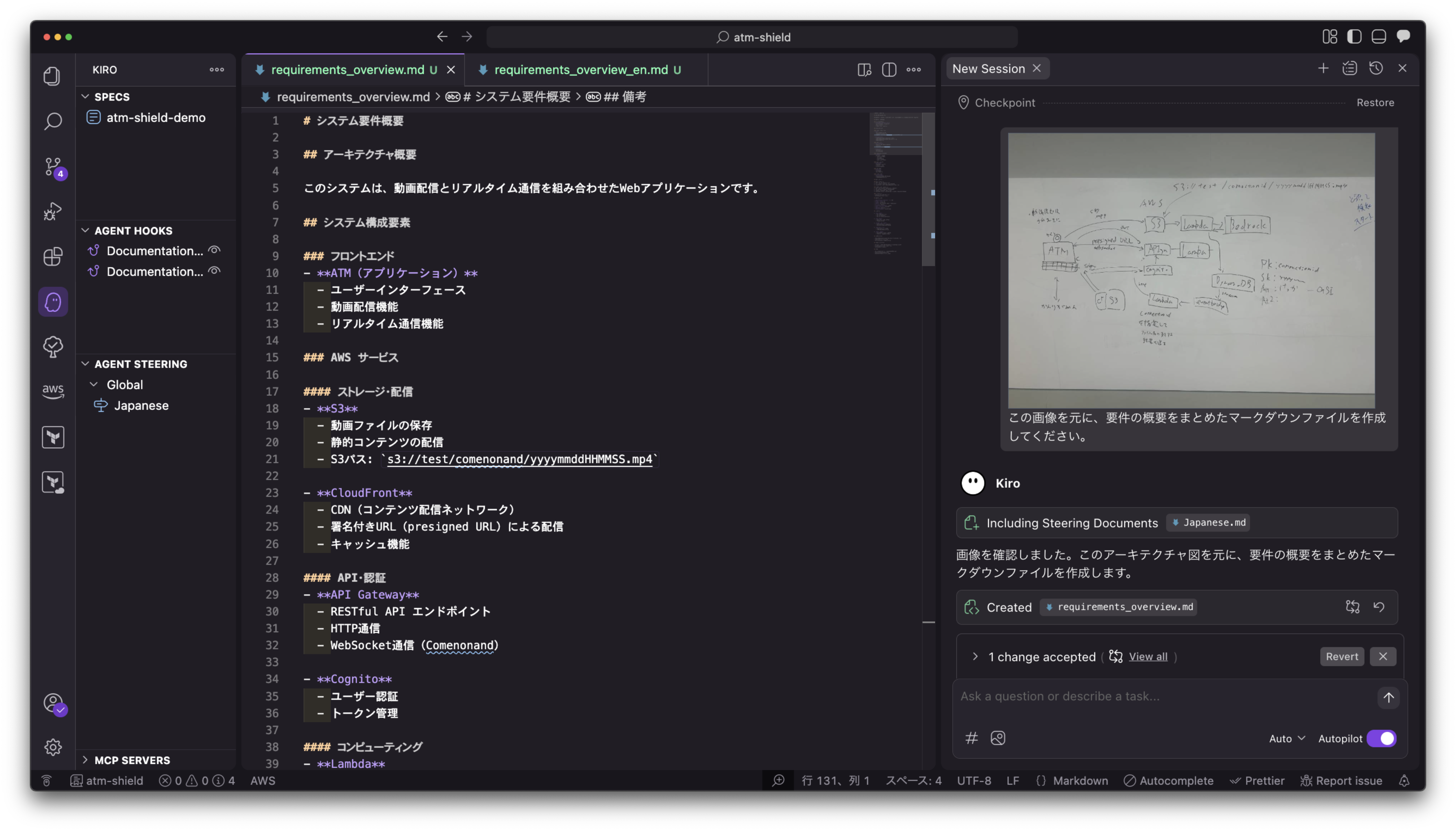 議論がひと段落したところで、ホワイトボードに書かれた内容をスマートフォンで撮影しました。そして、その写真を Kiro に読み込ませました。Kiro は画像認識機能を持っているため、手書きの図や文字を理解し、テキストとして文字起こしすることができます。これを元に人間がレビューを行い、システムの概要を作成し、後続の Kiro の Spec 機能を活用する際の土台としました。