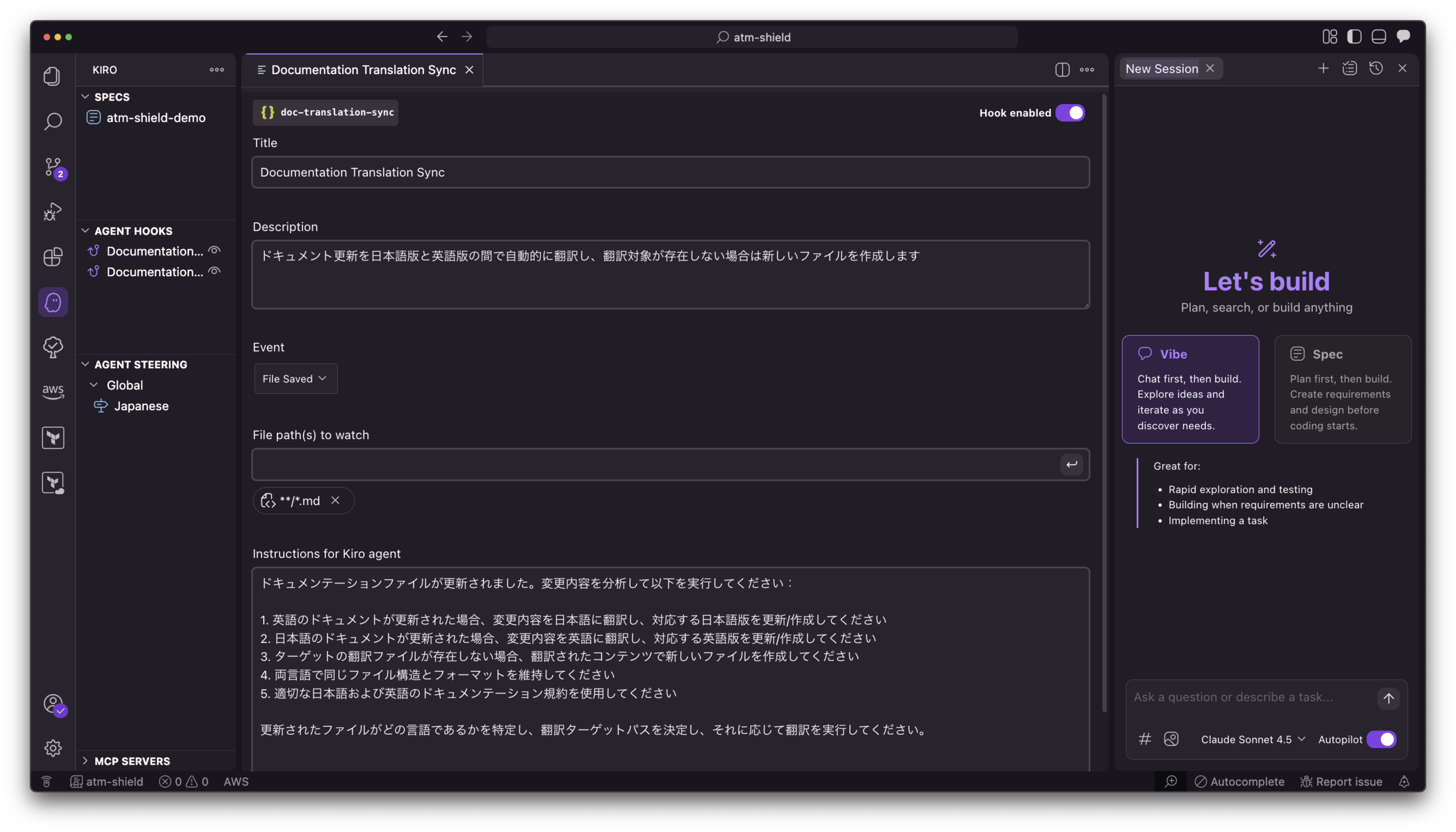 ハッカソンでは、最終的に英語でプレゼンテーションを行う必要がありました。Kiro を使えば、日本語で書いた仕様書や設計書を、Agent Hooks を用いて英語に翻訳できます。Kiro の Agent Hooks は、AI 駆動のアクションをトリガーにして事前定義されたエージェントアクションを自動的に実行するツールです。Agent Hooks については詳しくは、「Kiro の AI エージェントフックで開発ワークフローを自動化する」をご覧ください。