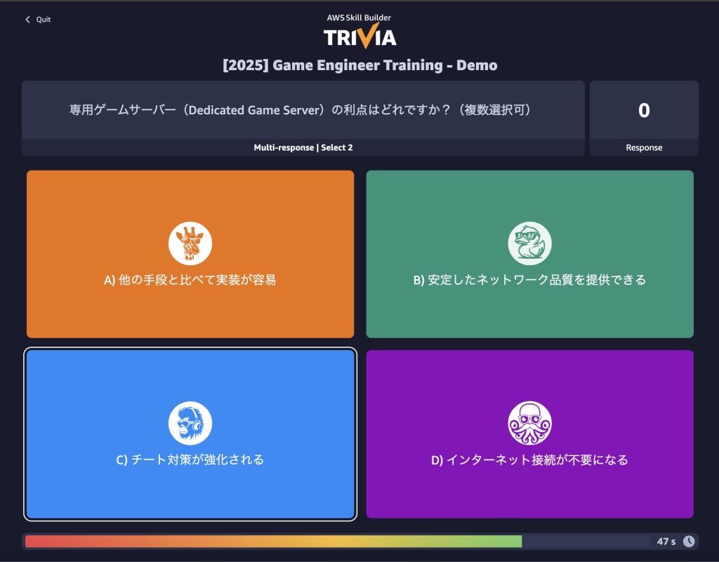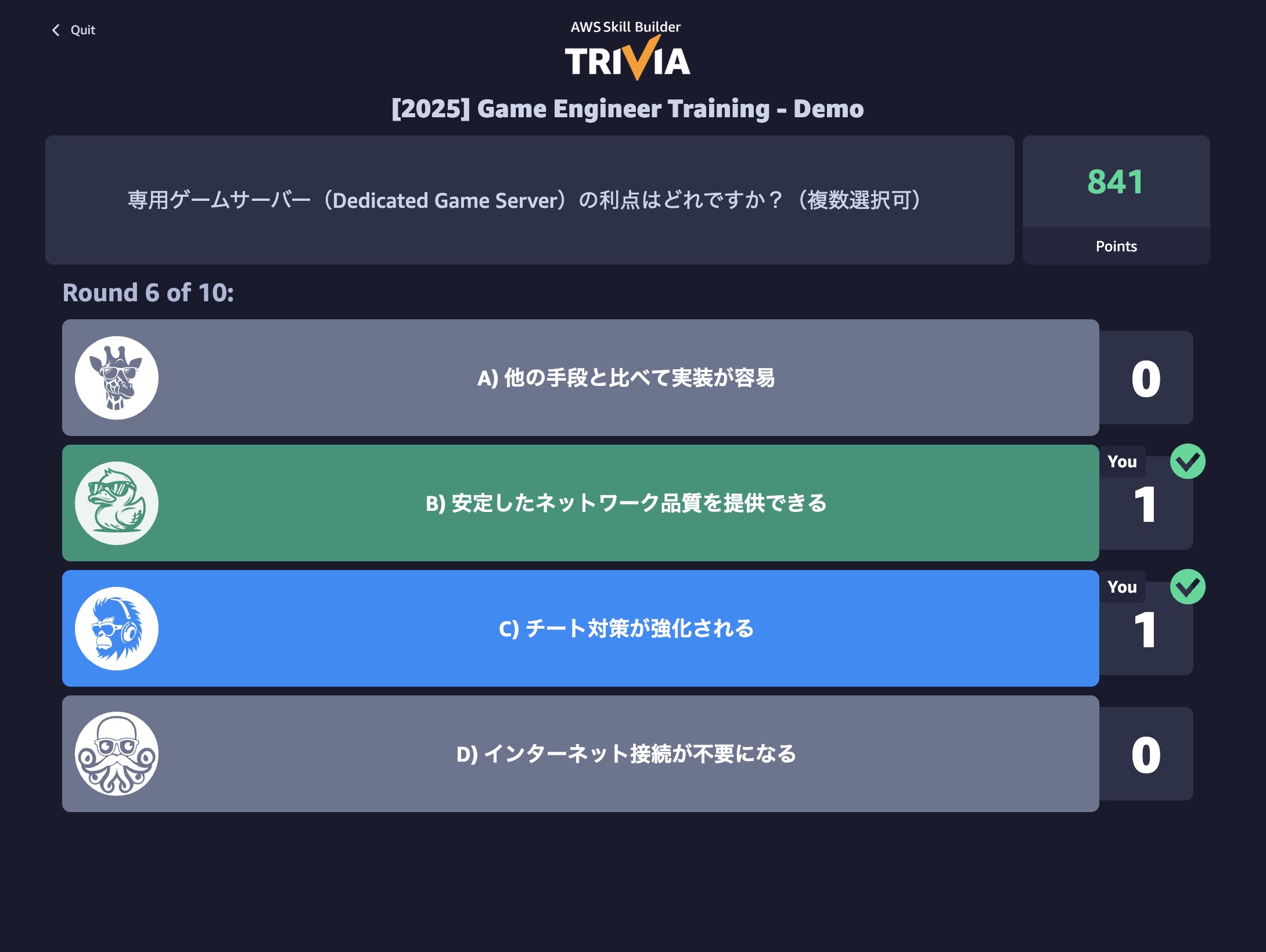技術理解度の測定には、AWS Skill Builder Triviaを活用し、ゲーム感覚で学習効果を測定できる仕組みを導入しました。AWS Skill Builder Triviaは、リアルタイムでマルチプレイヤー競争が可能なクイズプラットフォームです。本研修では、5日間の学習内容の復習を目的として、研修で扱った技術要素に関するカスタムクイズを作成し活用しました。