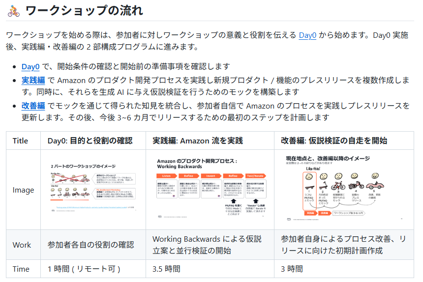 もちろん、生成 AI の出力結果は完璧ではありません。参加者の知見や経験を持ち寄り、生成された顧客の体験や発明が妥当かどうか、確認しながら進めていきます。主催者 (ファシリテーター)用のガイドもページに記載しており、これまでのワークショップの経験から気を付けるべき点やタイムテーブルの例などをまとめています。