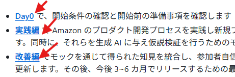 このような「言語化」により生成 AI へ正確な指示を与えることができ、ファシリテーションの精度を高めています。下記の「当日のガイド」に従い進めていけば、手早くかつ再現性の高いプロダクト開発プロセスを実践できるようになっています。