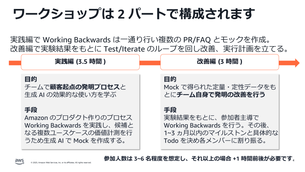 改善編の前半は参加者自身による Working Backwards 、後半 1 時間は今後の計画を立てるために配分しています。前半の時間配分は、参加者の Working Backwards に対する評価に応じ時間配分を頂きます。プロセスが明確に区切られていることで、Listen に時間をあて顧客の反応分析に注力する、反応は良好であるためより差別化された体験を目指し Invent に注力する、といった状況に応じた対応を取ることが出来ます。