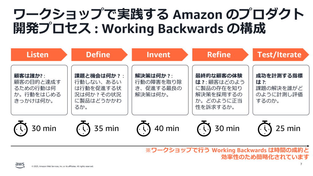実践編は Working Backwards の 5 つのプロセスに沿って進行します。Listen で顧客は誰か? 顧客はどのように行動しているか ? を観察し、Define で潜在する課題と企画を特定、Invent で課題を解決・機会を活用する発明を考案、Refine で発明による新しい顧客の体験をプレスリリースの形で描画し、Test/Iterate でその効果を計測、改善のサイクルを回していきます。各プロセスの時間が決められている通り、実践編では時間厳守でやり切ることにフォーカスしています。実践編の目的はプロセスの理解と体得で、ユースケースの質は改善編で高める構成となっています。実践編の資料は下記リンクからアクセスできます。