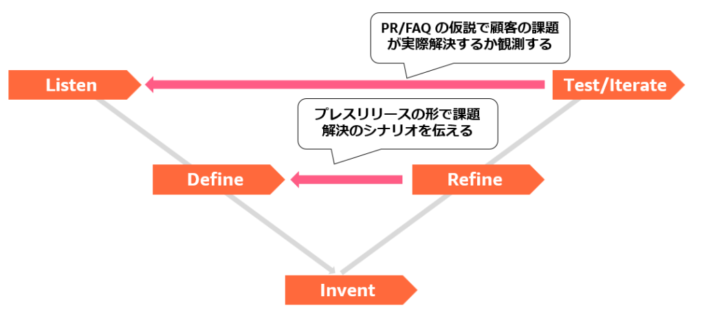 プロセス全体の流れを図にすると、次のようになります。Listen、Define で製品やサービスを届ける顧客の声から根本的な課題を特定し、Invent で解決のための発明、Refine と Test/Iterate で解決しているかどうか答え合わせをする形になります。事業責任者の方であればカスタマージャーニーマップやユーザーストーリーマッピングによる体験分析をされたことがある方もいるかもしれません。Working Backwards では、 Listen / Define の分析フェーズに当たります。また、ビジネスモデルキャンバスなどで収益を生むプロセスを立てる方もいると思いますが、Working Backwards では Test/Iterate で具体的に観測すべきビジネスの指標と目標値を決めます。Working Backwards のコンセプトは「最も難しい判断を最も最初に行う」ことであり、Refine でプレスリリースを書くことに象徴されるよう “明日この製品をリリースしたらそれは顧客に受け入れられ売れるのか ?” を顧客の体験面、ビジネスの成果指標面両方で検証するフレームワークになっています。