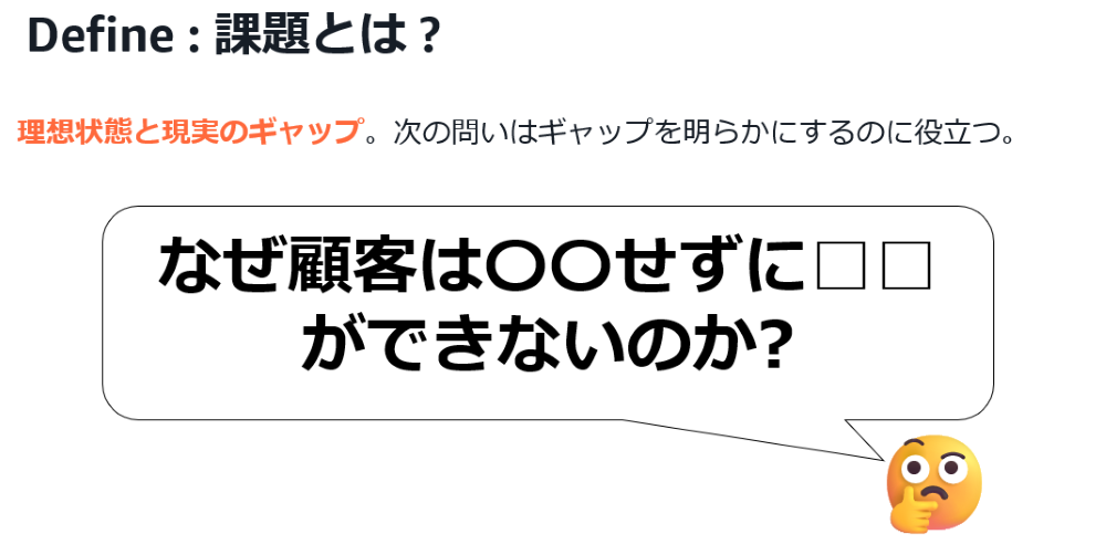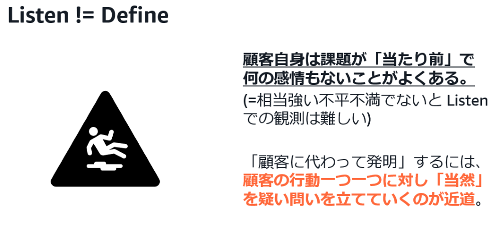 MLEW は、Working Backwards を「誰もが」実践できるよう、顧客・課題・発明・体験・観測、といった人により解釈が異なる言葉やプロセスを明確に定義しています。例えば、Define のフェーズでは「課題」とは何か、課題が顧客の声 (Listen) とどのように異なるのかを明確に示しています。また、Invent で行う課題に対する解決策 (発明) の考案でも、まず 「発明」とは何かを定義し、それと Define (課題) を発見するために立てた問いとどういう関係があるのか示しています。