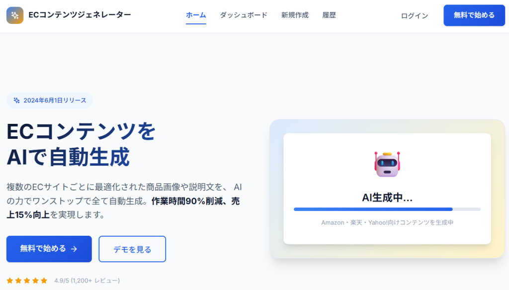 企画をプレスリリースとして執筆する Refine のフェーズが終了した後、AI 開発エージェントにプレスリリースを与えアプリケーションのモックを作成します。以下は EC サイトごとに異なるサイズや規格で商材を作るのが面倒という課題を生成 AI で解決する企画から生成した例です。ランディングページ、体験可能なモック、またモック内のページビューなどが参照可能なダッシュボードを構築します。