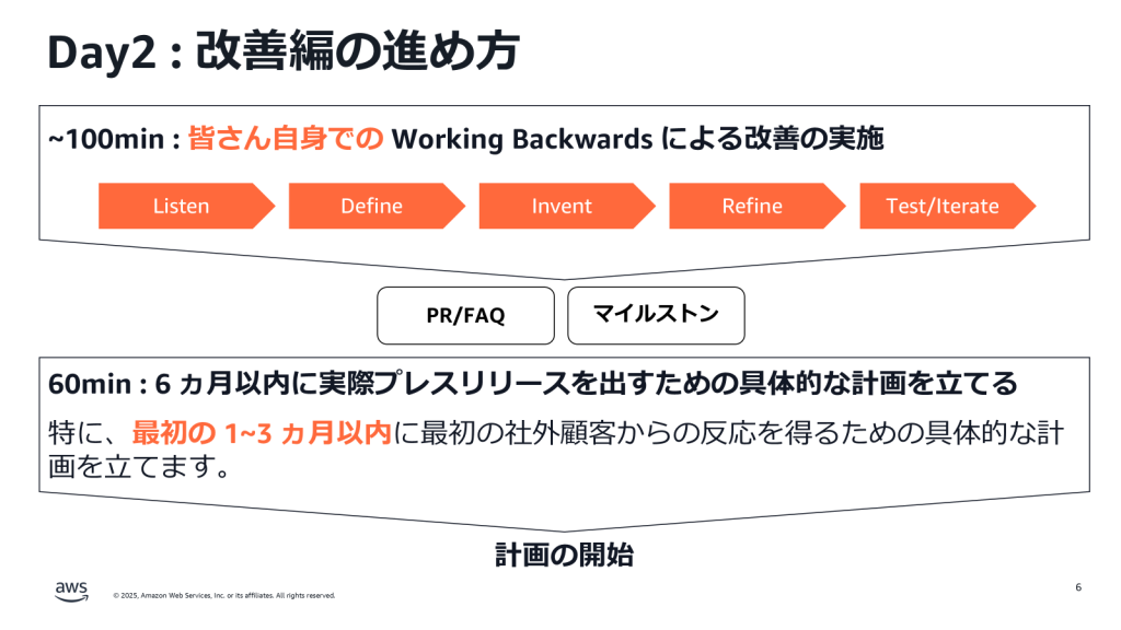 実践編は Working Backwards をやり切り体得することに注力しており、改善編は体得したプロセスを自ら行い企画を改善することに注力しています。改善編の後半では、具体的なタスクとスケジュールを必ず決めて終了します。