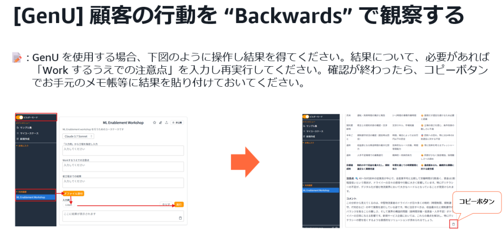 改善編は Working Backwards の最後のプロセスである Test/Iterate を実践します。すなわち、モックを通じ顧客候補の反応を “Test” し、そのインプットを “Listen” することで Working Backwards を “Iterate” するということです。通常のワークショップはウォーターフォールのようにプログラムをすべて終えてアウトプットが出たら終了ということが多いですが、MLEW では多くの製品開発プロセスがそうであるようにアウトプットから得られた反応を基に改善するまで行います。これまで、ワークショップで作成するのはプレスリリースのみ、しかも 1 本にしぼっていましたが、生成 AI により複数本のプレスリリースとモックが作れるようになりました。複数本の検証結果があることで、反応が芳しくない企画を捨てる、方向を変えるといった判断が行いやすくなりました。モックから反応を得る期間を確保するため、実践編と改善編の間は 1 週間は空けるスケジュールを推奨しています。
