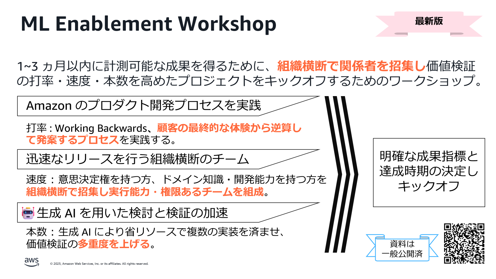 Amazon では「顧客に必要とされないものを作らない」ための Working Backwards という製品開発プロセスがあり、リスクに対する有効な対策の一つとなっています。今回ご紹介する ML Enablement Workshop (MLEW) はそれを誰もが実践できるよう体系化されたワークショップです。これまで、JINS 様 (AWS Summit 2025 ご登壇) や MUFG 様 (re:Invent 2024 ご登壇)、また BASE 様など業種を問わず多くのお客様が「顧客駆動」でプロダクトを開発するために利用され成果を実感されています。「誰もが」とある通り、MLEW の資料は GitHub で公開されており事例を含め参照できます。2025 年 9 月に GitHub で公開された version 3 は Working Backwards の各プロセスを進めるために生成 AI を活用しており、よりスムーズに進められるようになっています。公開後 1 ヵ月ほどで約 20 社に提供されており、この数は昨年 1 年分の提供数に匹敵します。この提供スピードは、お客様のニーズはもちろん「誰でも」行えるようにするための体系化と生成 AI による効率化が機能していることを示しています。2025 年 10 月に行われた 7 社同時での提供では、ほぼすべての会社がサポートなしにプロセスを完了しました。