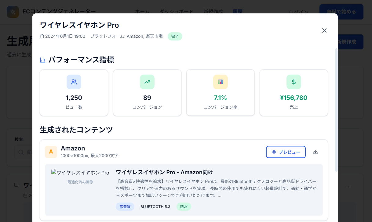 企画をプレスリリースとして執筆する Refine のフェーズが終了した後、AI 開発エージェントにプレスリリースを与えアプリケーションのモックを作成します。以下は EC サイトごとに異なるサイズや規格で商材を作るのが面倒という課題を生成 AI で解決する企画から生成した例です。ランディングページ、体験可能なモック、またモック内のページビューなどが参照可能なダッシュボードを構築します。